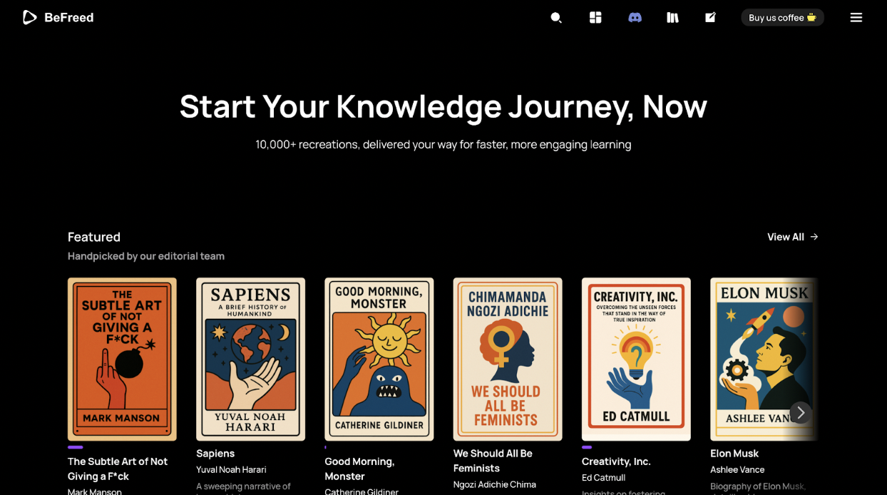 Want to be more productive and efficient to achieve your goals? BeFreed, the best AI knowledge companion, built to help you excel in the areas that matter most: mental health, productivity, social skills, business, and beyond. Chat with your AI reading buddy about your life and goals, and it’ll recommend books and make a summary tailored just for you. Already reading a specific book? Dive deeper with focused discussions to enrich your understanding and learning experience.